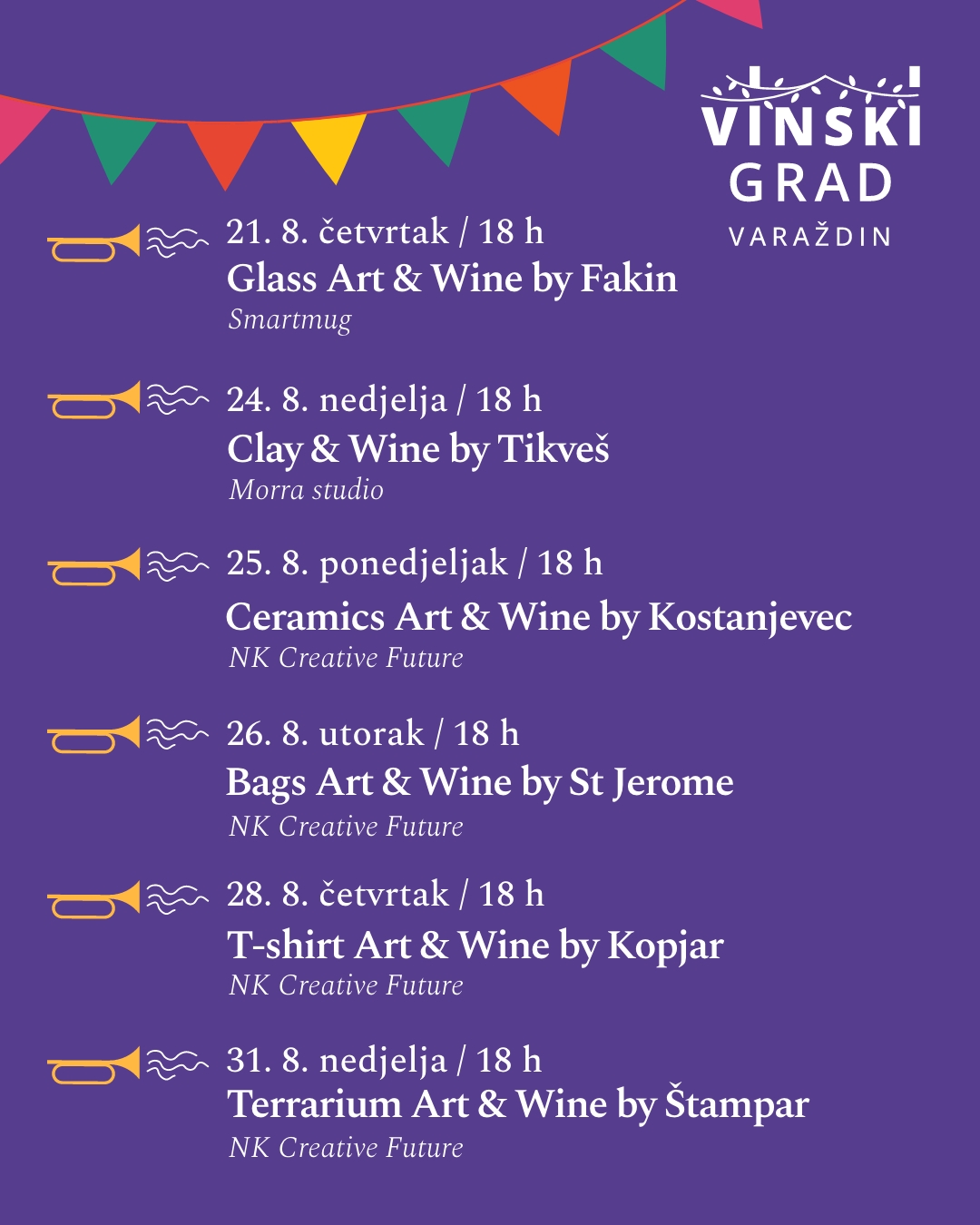 Organizatori su i ove godine pripremili program kreativnih radionica. Inspirativna kulisa Starog grada bit će idealna za sve koji žele spojiti umjetnost i uživanje u vinu. Ulaznice se mogu kupiti putem ove poveznice.