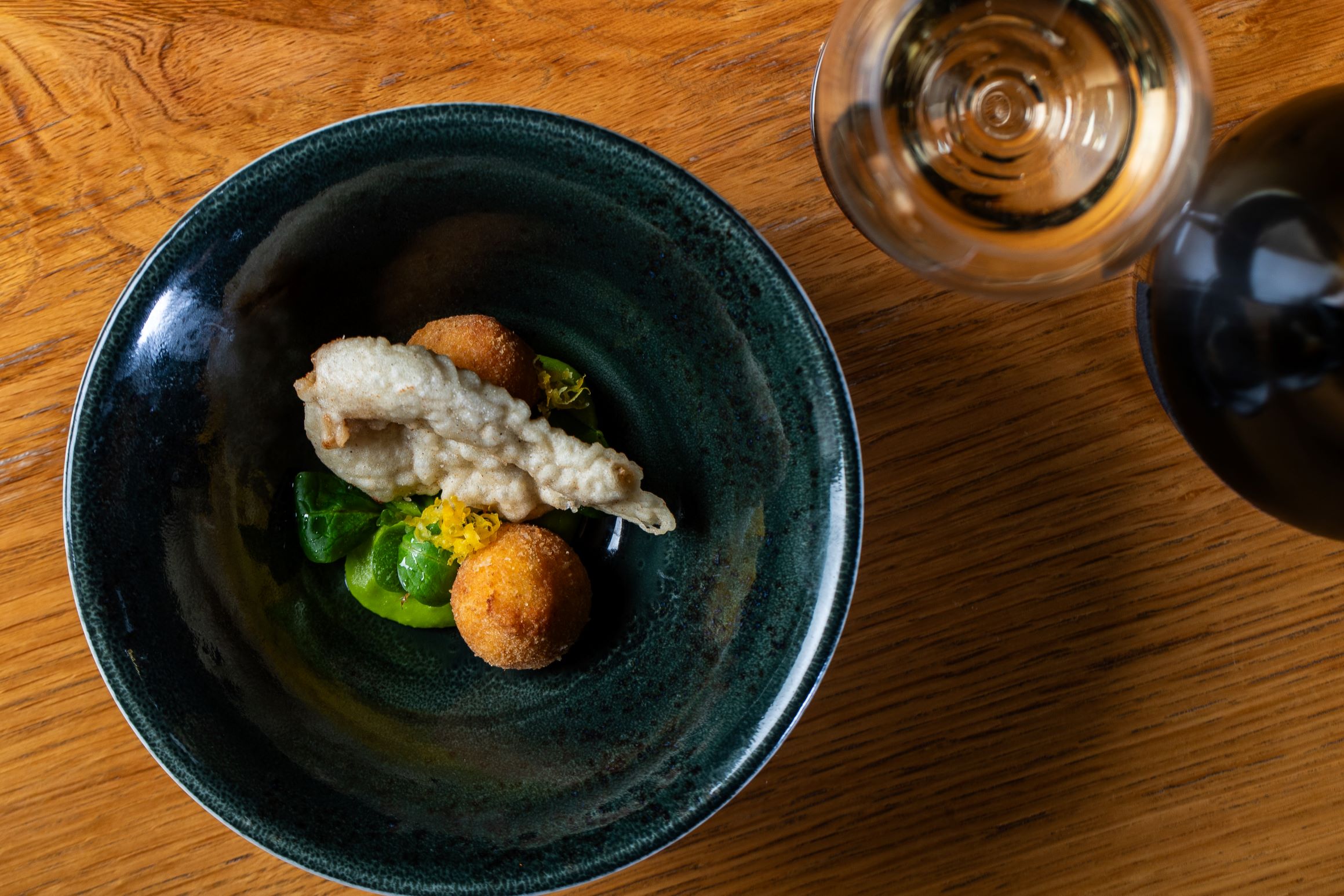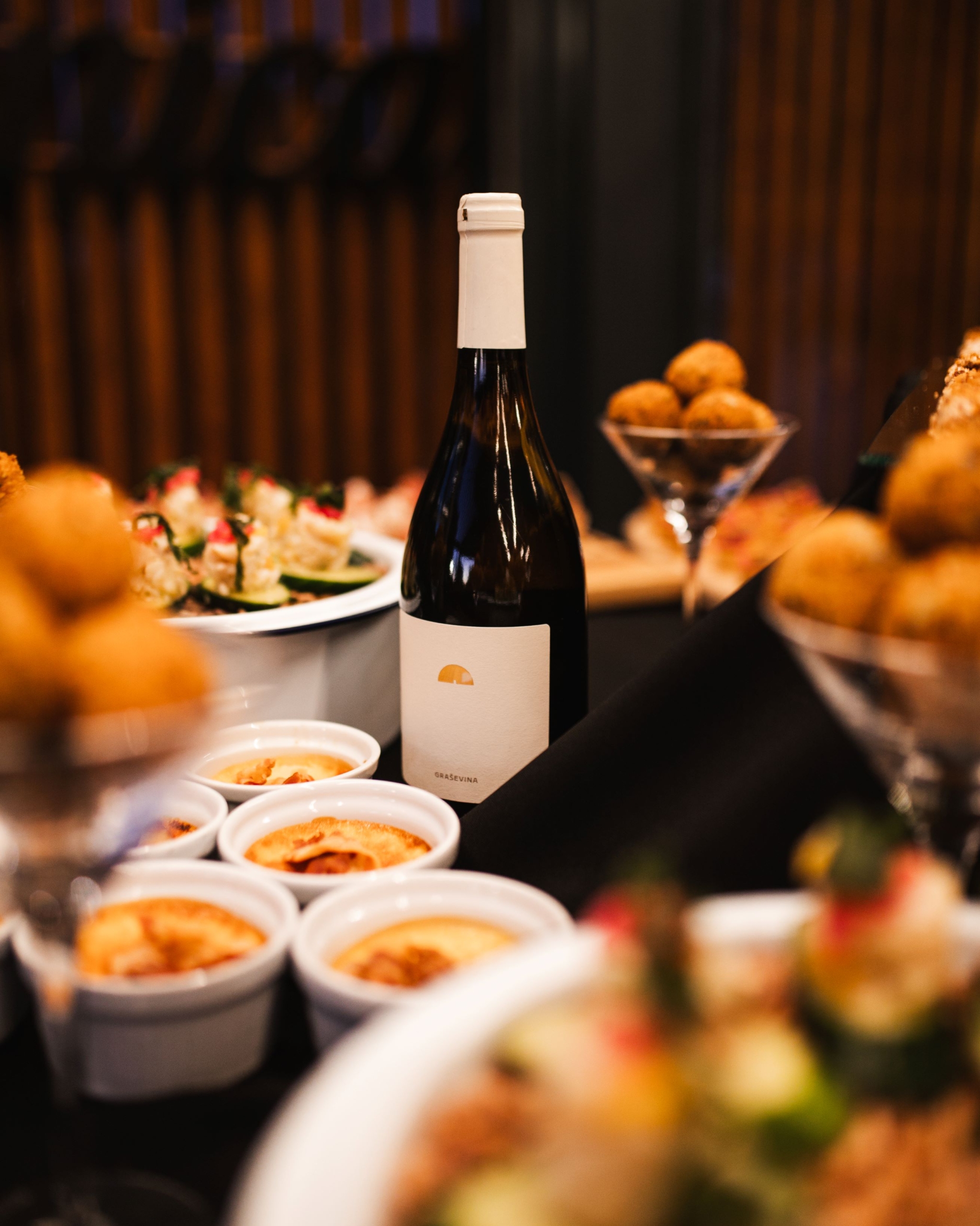 Degustacijska večera, održana u ovom šarmantnom restoranu uz obalu Biljskog jezera, bila je jedinstveni spoj enologije i gastronomije. Mlad i ambiciozan tim restorana pripremio je poseban degustacijski meni s nekoliko sljedova koji su savršeno pratili vina Zlatnog Brda. Večer je otvorena domaćom focacciom s mirodijama, paštetom od divljači i fritiranom rukolom, uz premijerno predstavljenu Graševinu Zlatno Brdo 2024. Ovo vino s bijelom minimalističkom etiketom oduševilo je svojom svježinom i jedinstvenim stilskim zaokretom unutar dosadašnje ponude vinarije. Nakon toga, uslijedio je citrusni rižoto s poširanim filetima smuđa i pjenicom od mente, a zatim predjelo od žabljeg kraka u tempuri na kremi od graška s kroketima od svježeg sira. Glavni dio večere činila je sous vide teleća koljenica s pireom od pečene paprike i umakom, kojoj je savršeno pristajao Crni Cuvée Čingi Lingi – rezultat suradnje vinarije i restorana.