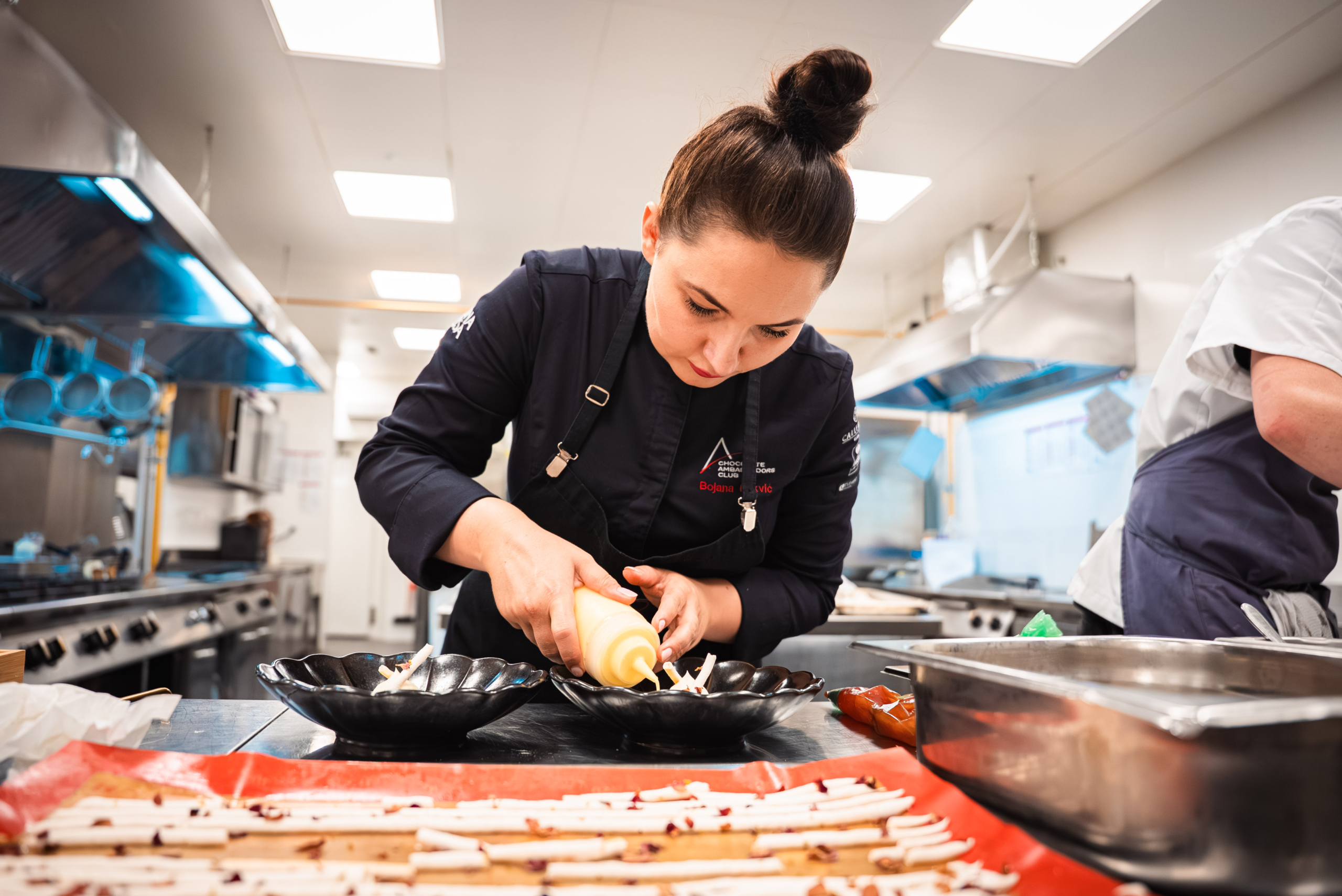 Savršeno usklađivanje okusa osigurano je pomnom selekcijom vina. Uz lokalna vina Gospoje, večeru prate i odabrane etikete vinarije Tomaz, koje besprijekorno nadopunjuju svaki slijed. Za slatki zaključak večere zadužena je Bojana Bukvić koja je umjesto jednog deserta kreirala pravu simfoniju, raskošni izbor čokoladnih petits fours.