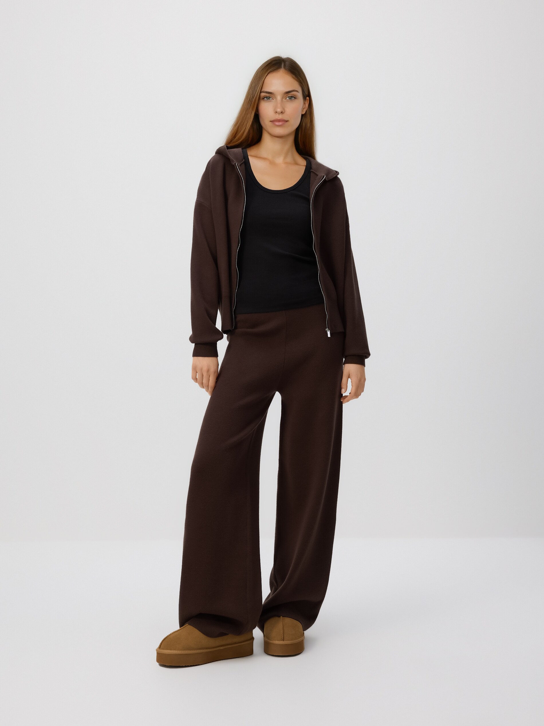 Udobnost i stil napokon su se sreli u savršenom jesenskom outfitu! Ovaj cozy komplet iz Reserved kolekcije jednostavno osvajа — pletena majica s kapuljačom i široke hlače u bogatoj čokoladnoj nijansi savršeno spajaju eleganciju i opušteni look.