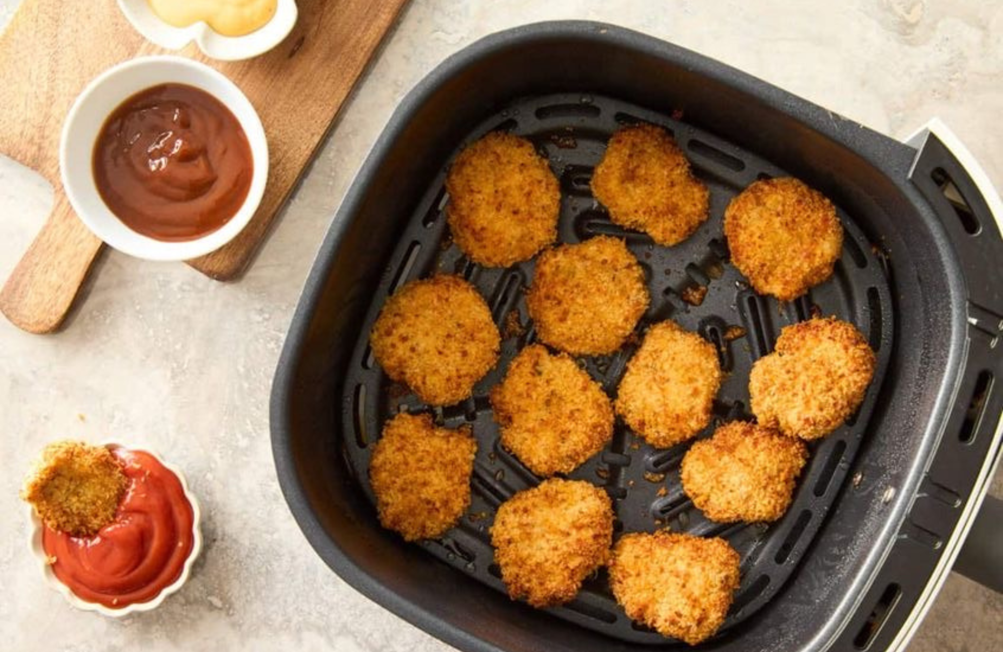 Oblikujte nuggetse, uvaljajte ih u smjesu od jaja, brašna i prezli. Posložite ih u košaru Airfryer-a i pecite 10 minuta na 200°C. Dobit ćete sočne, hrskave nuggetse bez potrebe za prženjem u dubokom ulju.