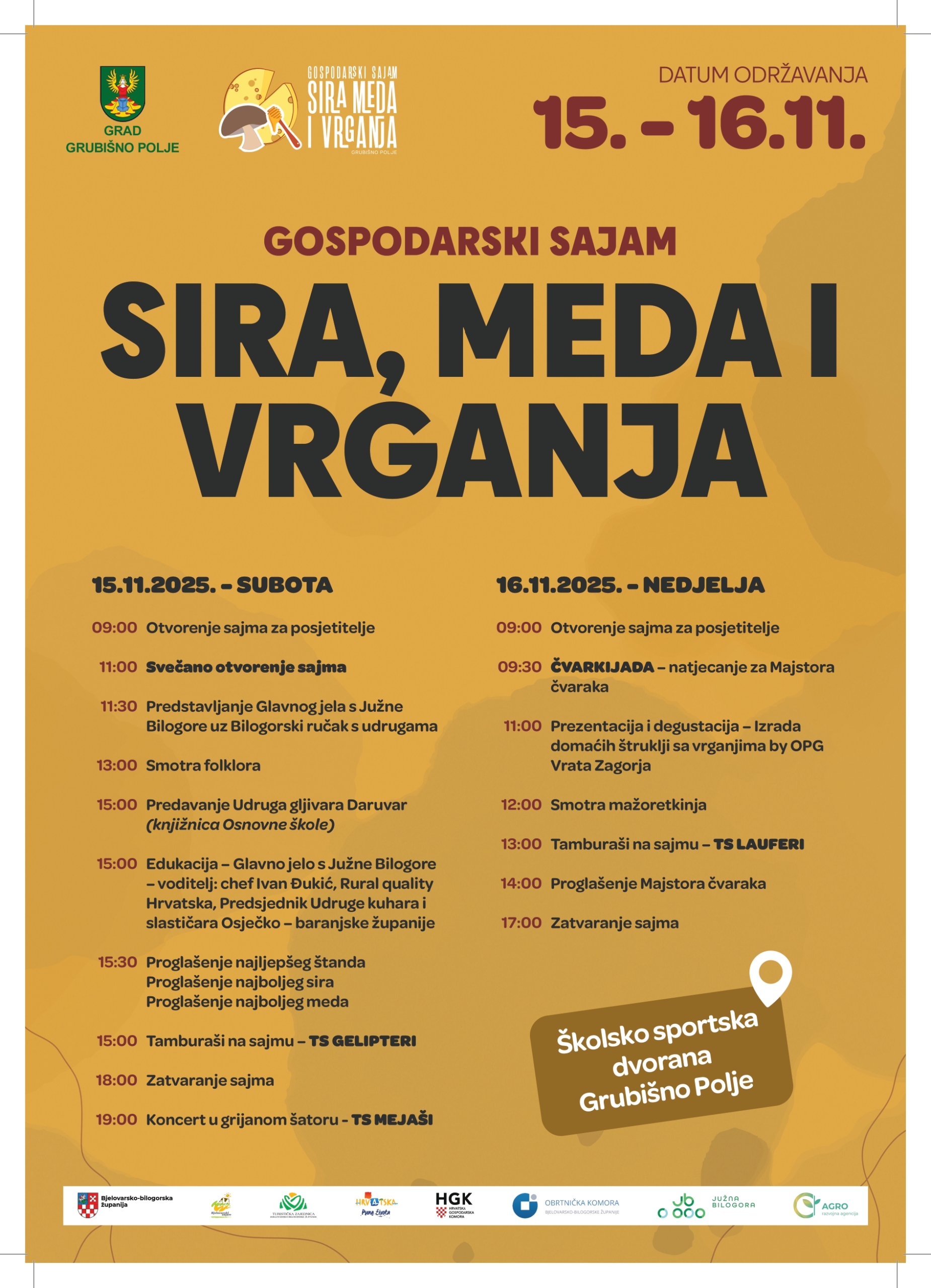 Grubišno Polje ovog će vikenda, 15. i 16. studenoga, postati središte mirisa, okusa i tradicije. U školsko-sportskoj dvorani održava se 19. Gospodarski sajam sira, meda i vrganja, u organizaciji Grada Grubišnog Polja, Turističke zajednice područja Južna Bilogora i Razvojne agencije AGRO.