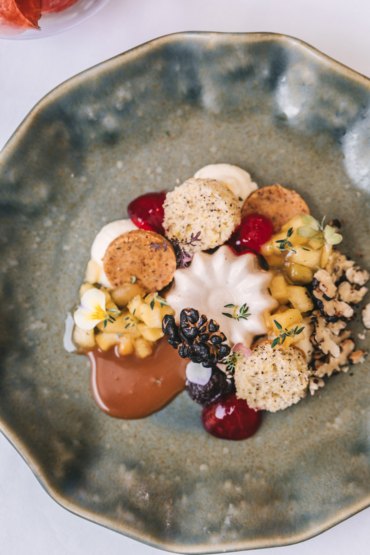 Za kraj — tri promišljena i zavodljiva slatka trenutka. Mousse od oraha s makovim biskvitom, kremom od skute, karameliziranim jabukama i hrskavim orasima donosi savršenu jesensku harmoniju okusa. Za slojevit i intenzivan doživljaj tu je topli brownie od banane i kave s tahinijem, karameliziranim bananama i crumbleom od smeđeg maslaca. A za nešto laganije, ali ledeno: semifreddo s kupinom, ganacheom od kupina, spužvom od lješnjaka i tonke te finim sirupom od bosiljka — desert koji će vas zasigurno osvojiti.