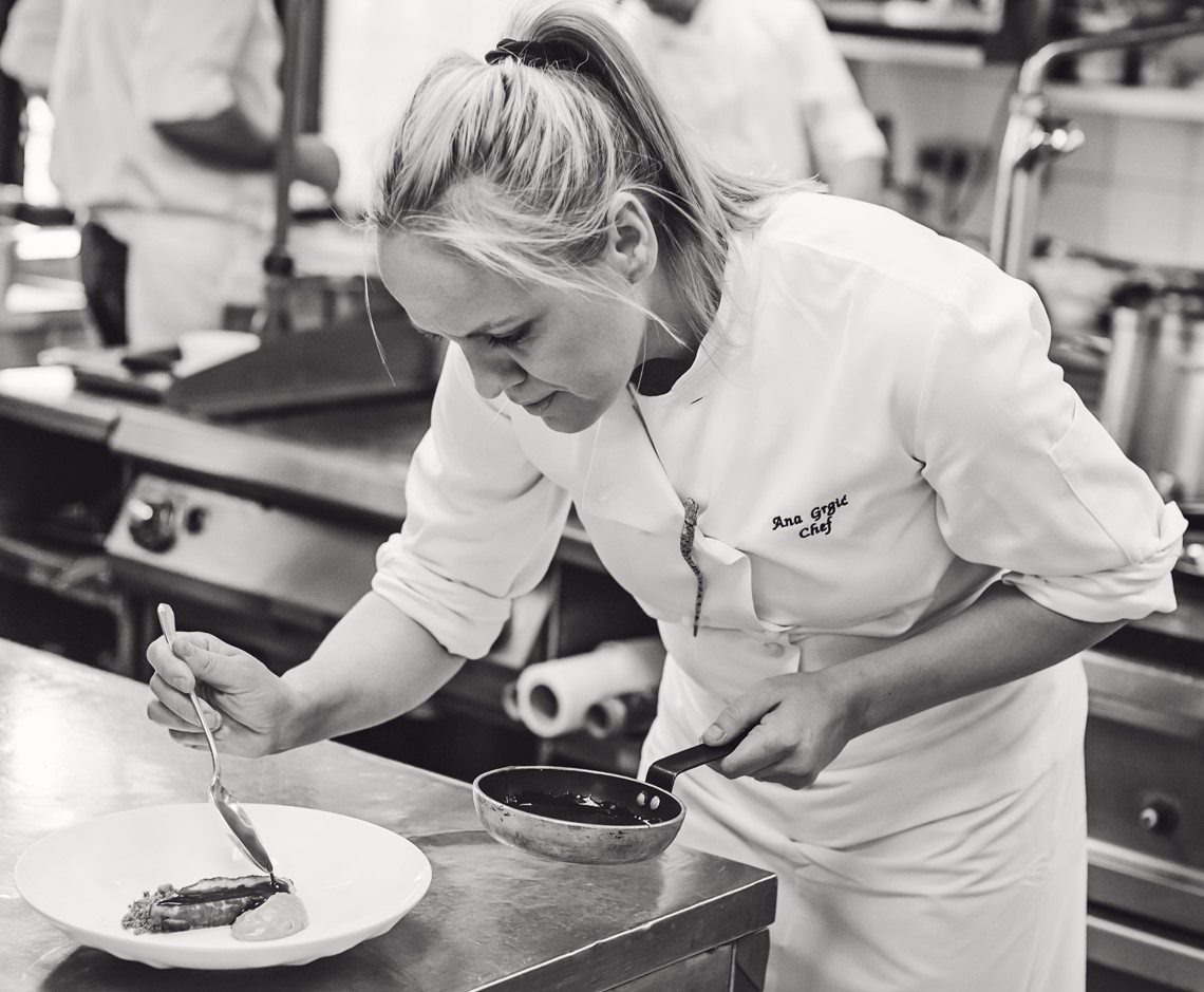 Glavni slijed donosi confit od mlade janjetine s palačinkom od crne leće, umakom od anisa i hrskavim čičokama. Za kraj slijedi desert koji zaokružuje večer – meringa s malinama, biskvit od badema i rikote te perle kokosa i bijele čokolade.