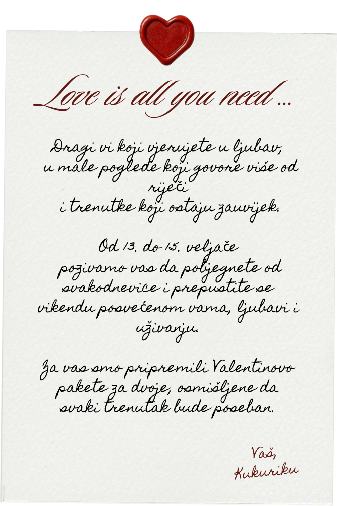 Ako se odlučite samo za večernji izlazak, 14. veljače u Hotelu Kukuriku očekuje vas posebno valentinovsko izdanje večere uz živu glazbu, po cijeni od 65 € po osobi. Večer je zamišljena kao opušteno, ali elegantno gastronomsko iskustvo u romantičnoj atmosferi.