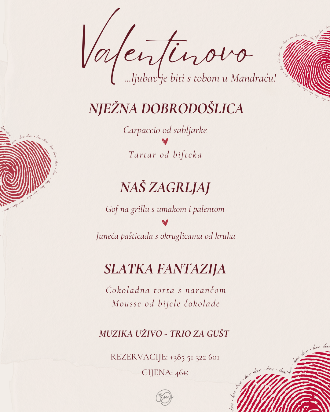 Volosko je odavno poznato kao jedno od najromantičnijih mjesta na Kvarneru, a ovog Valentinova Mandrać postaje idealna kulisa za večer posvećenu ljubavi. Spoj intimnog ambijenta, pogleda na more i posebno osmišljenog menija garantira doživljaj koji nadilazi klasičnu večeru za dvoje.