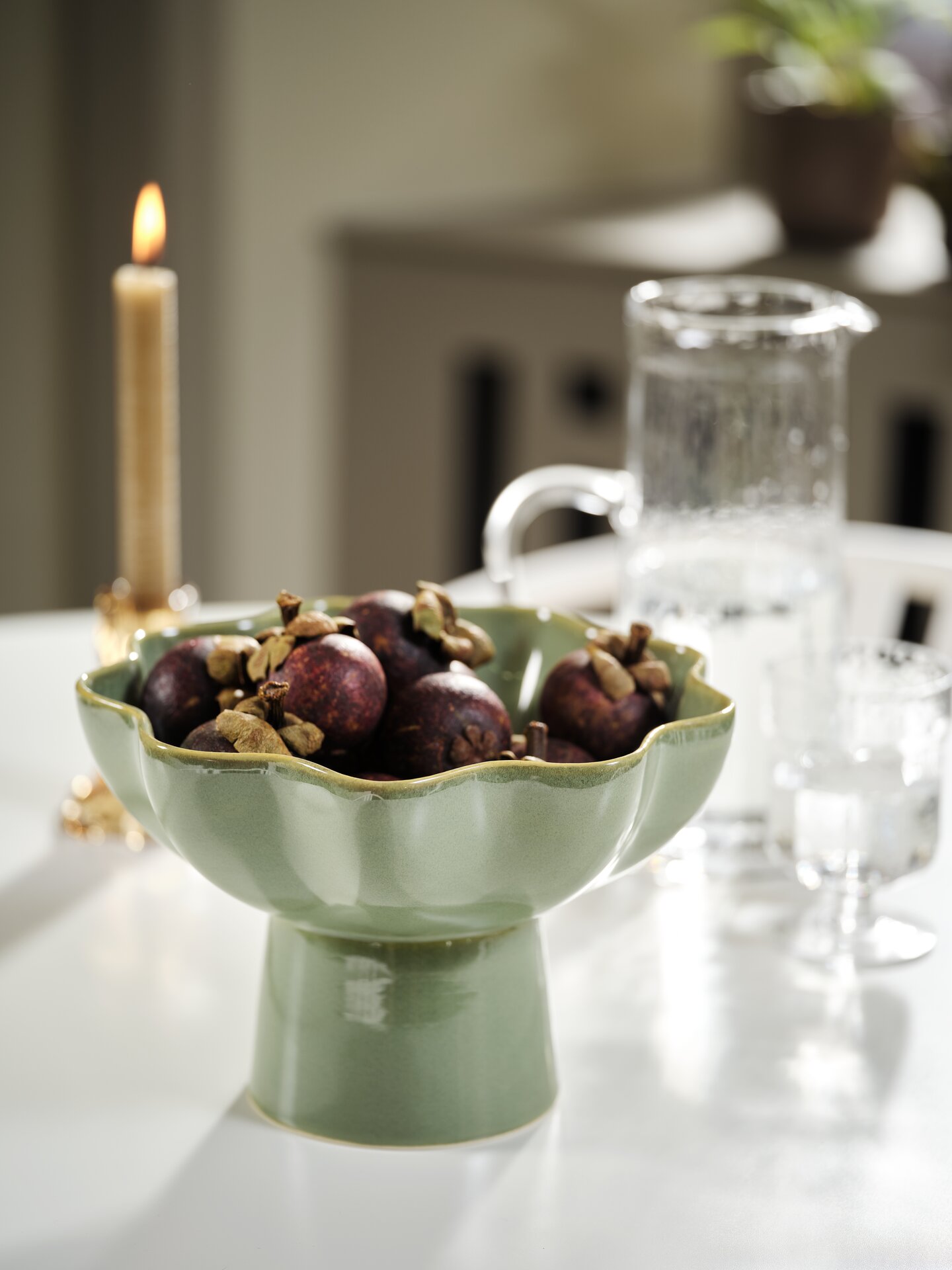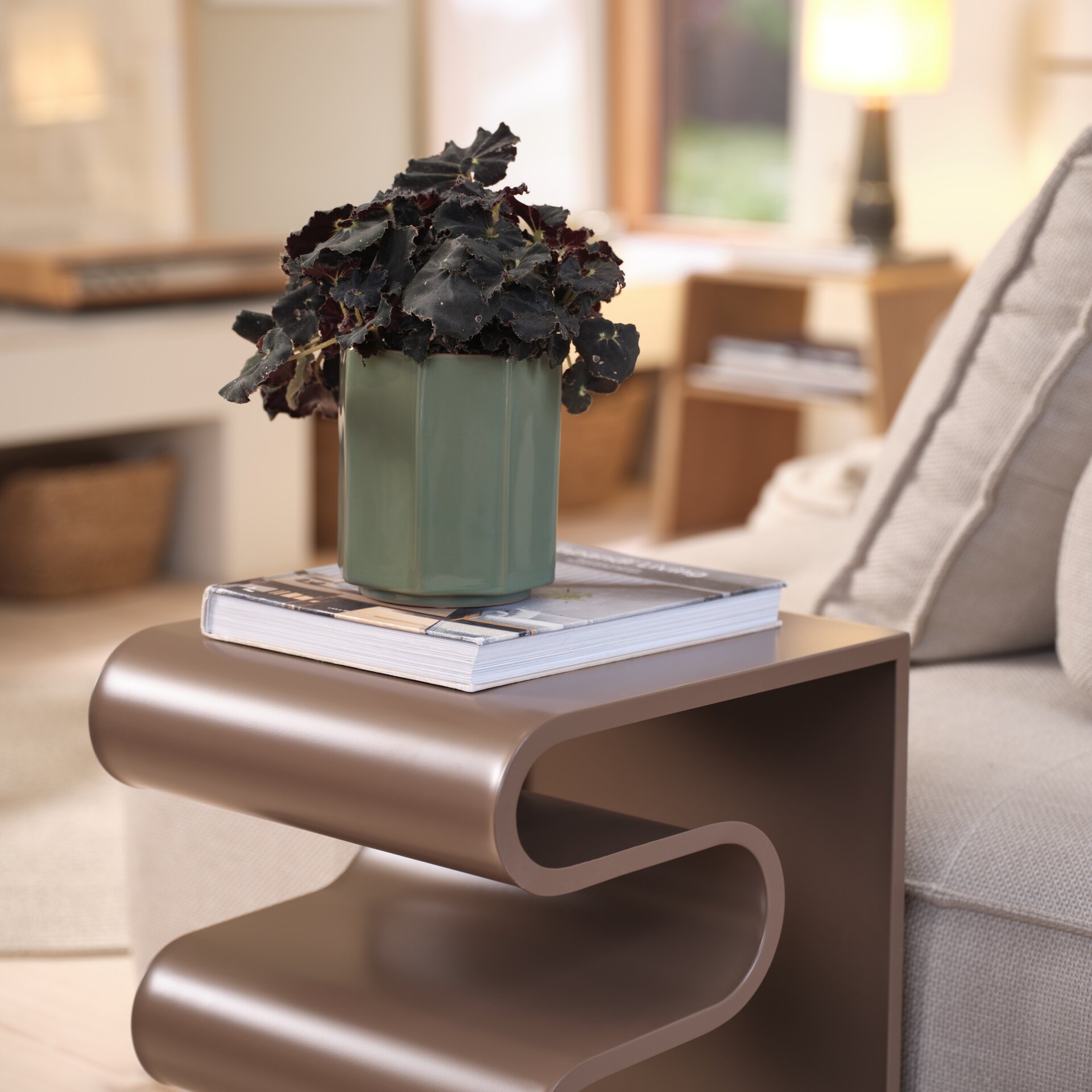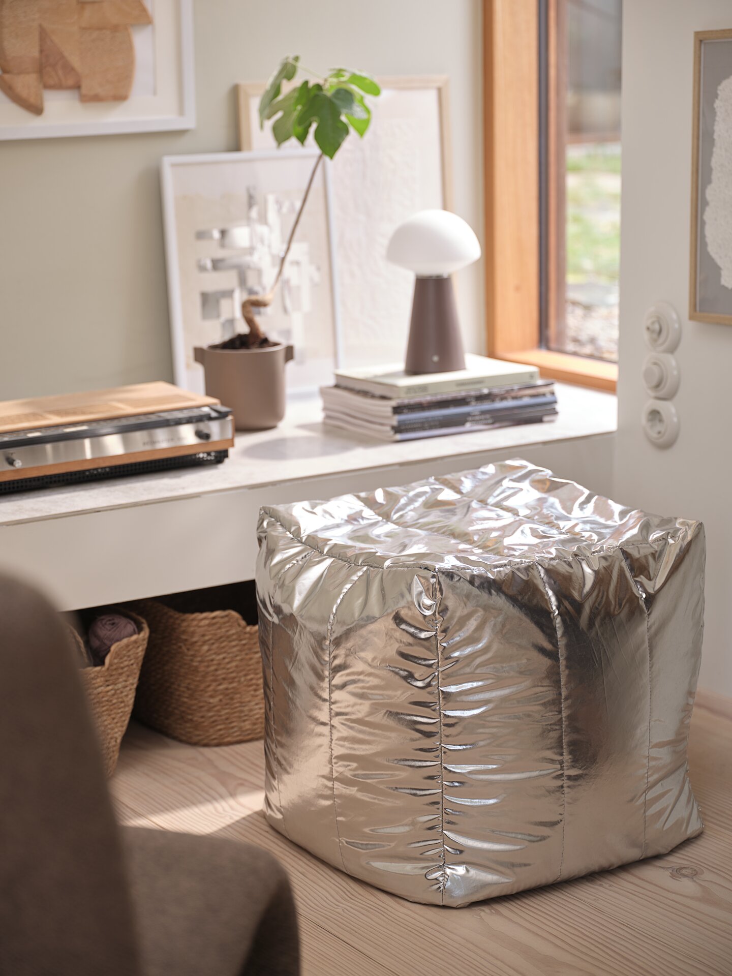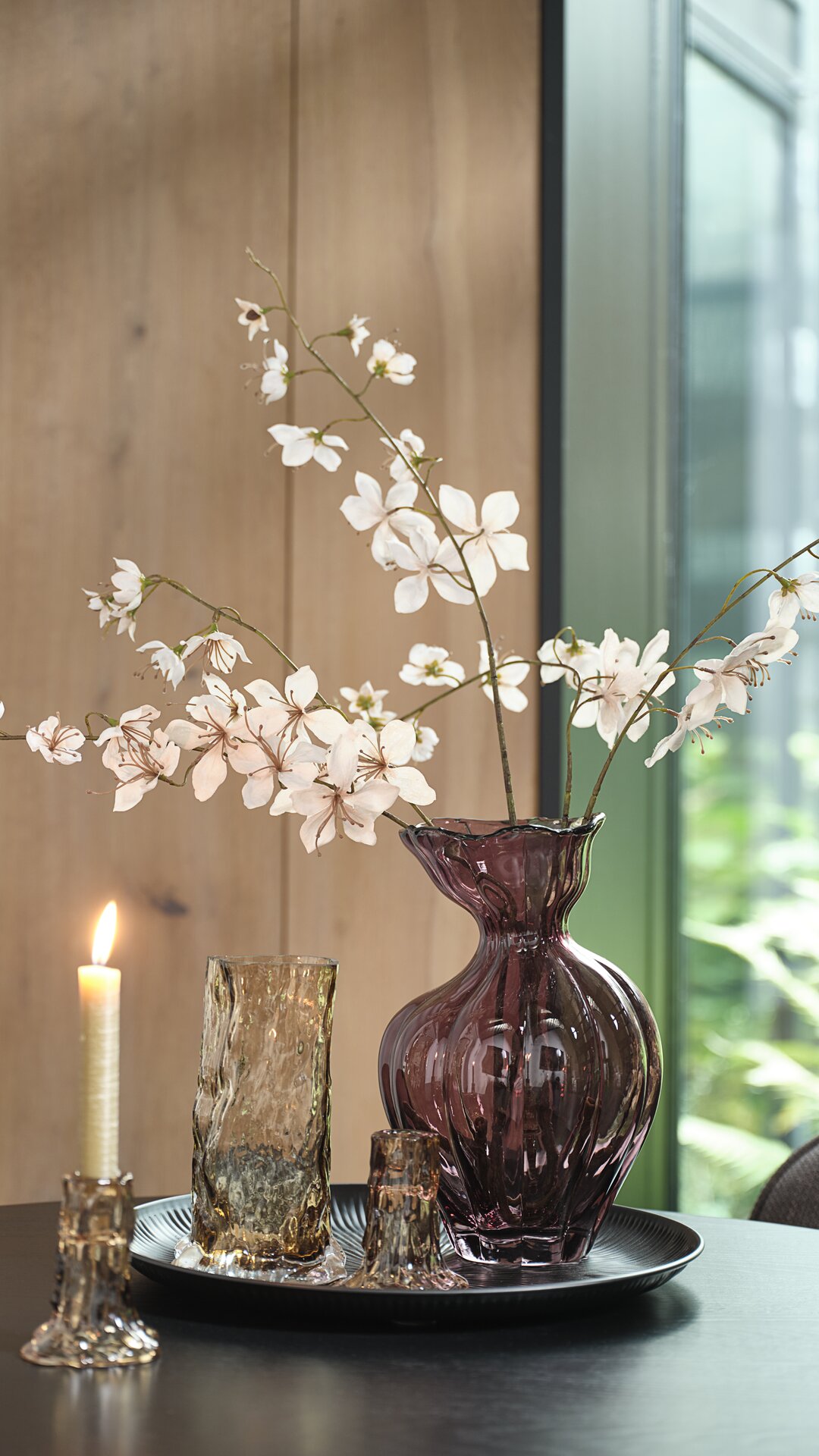 Boje inspirirane prirodom, poput zelenih i tamno ljubičastih tonova, kombiniraju se s metalnim i sjajnim elementima koji prostoru daju suvremeni, urbani karakter. To se posebno ističe kroz detalje poput metalnih svijećnjaka i tabure te manjih komada namještaja s reflektirajućim površinama.