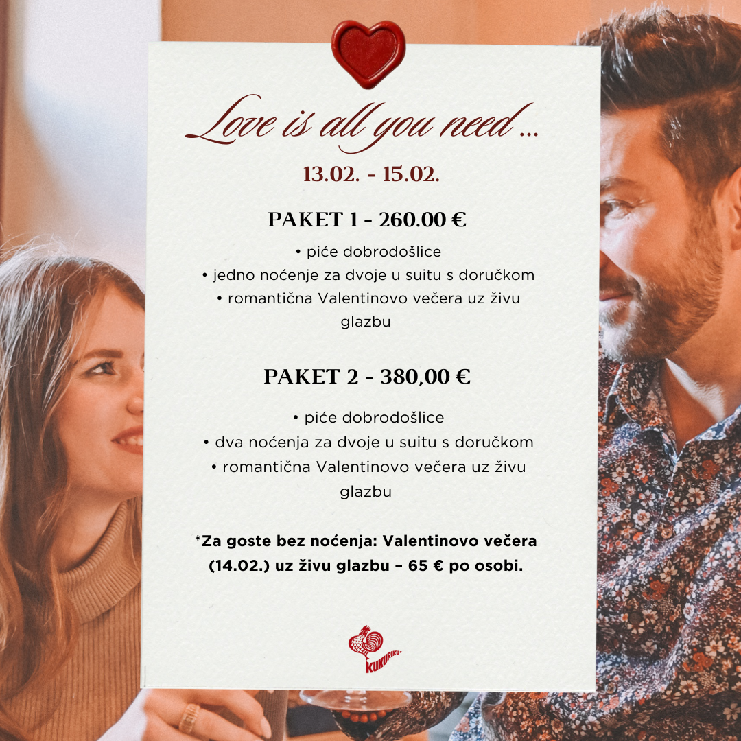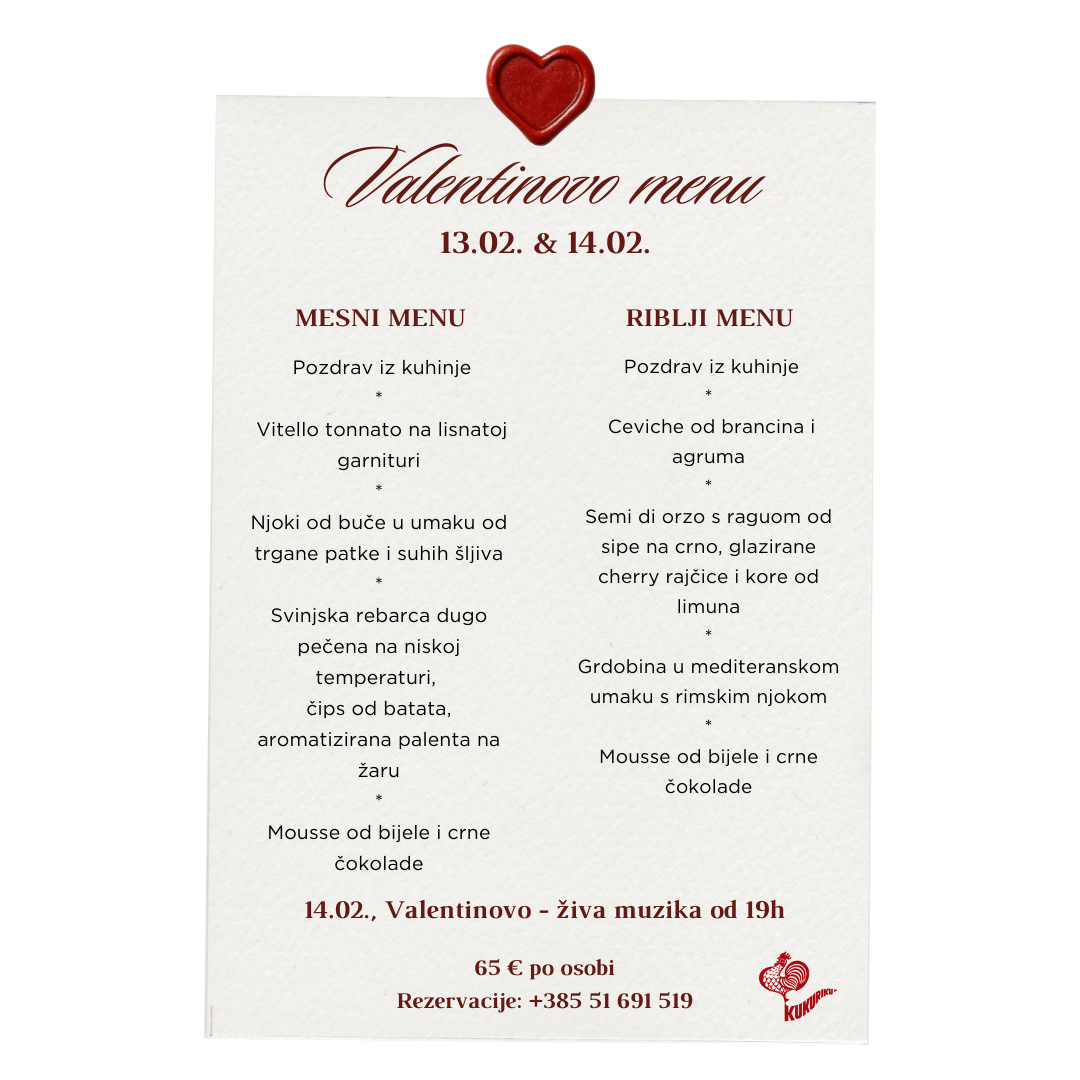 Za ovogodišnje Valentinovo, restoran Kukuriku pripremio je poseban degustacijski meni koji će razmaziti vaša nepca i upotpuniti svaku romantičnu večer. Za potpuni doživljaj, atmosfera će biti obogaćena glazbom uživo, stvarajući savršen ambijent za slavlje ljubavi i uživanje u intimnoj, romantičnoj večeri. Za parove koji žele više od jedne večere, pripremljeni su promotivni paketi koji uključuju smještaj i večeru. Rezervirajte svoje mjesto na vrijeme, na broj: +385 51 691 519.