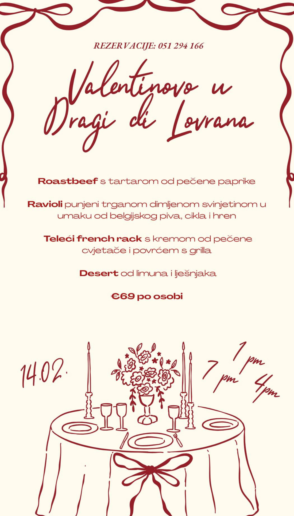 Draga di Lovrana za Valentinovo priprema posebno osmišljen meni za večer u dvoje, u ambijentu koji ostavlja bez daha. Uz predivan pogled na Kvarner, gosti mogu uživati u slijedu pažljivo biranih jela – od roastbeefa s tartarom od pečene paprike, preko raviola punjenih trganom dimljenom svinjetinom u umaku od belgijskog piva s ciklom i hrenom, do sočnog telećeg french racka s kremom od pečene cvjetače i povrćem s grilla. Večeru zaokružuje desert od limuna i lješnjaka. Cijena menija iznosi 69 € po osobi, a dostupni termini na Valentinovo su u 13:00, 16:00 i 19:00 sati. Rezervacije su obavezne na telefon: 051 294 166.