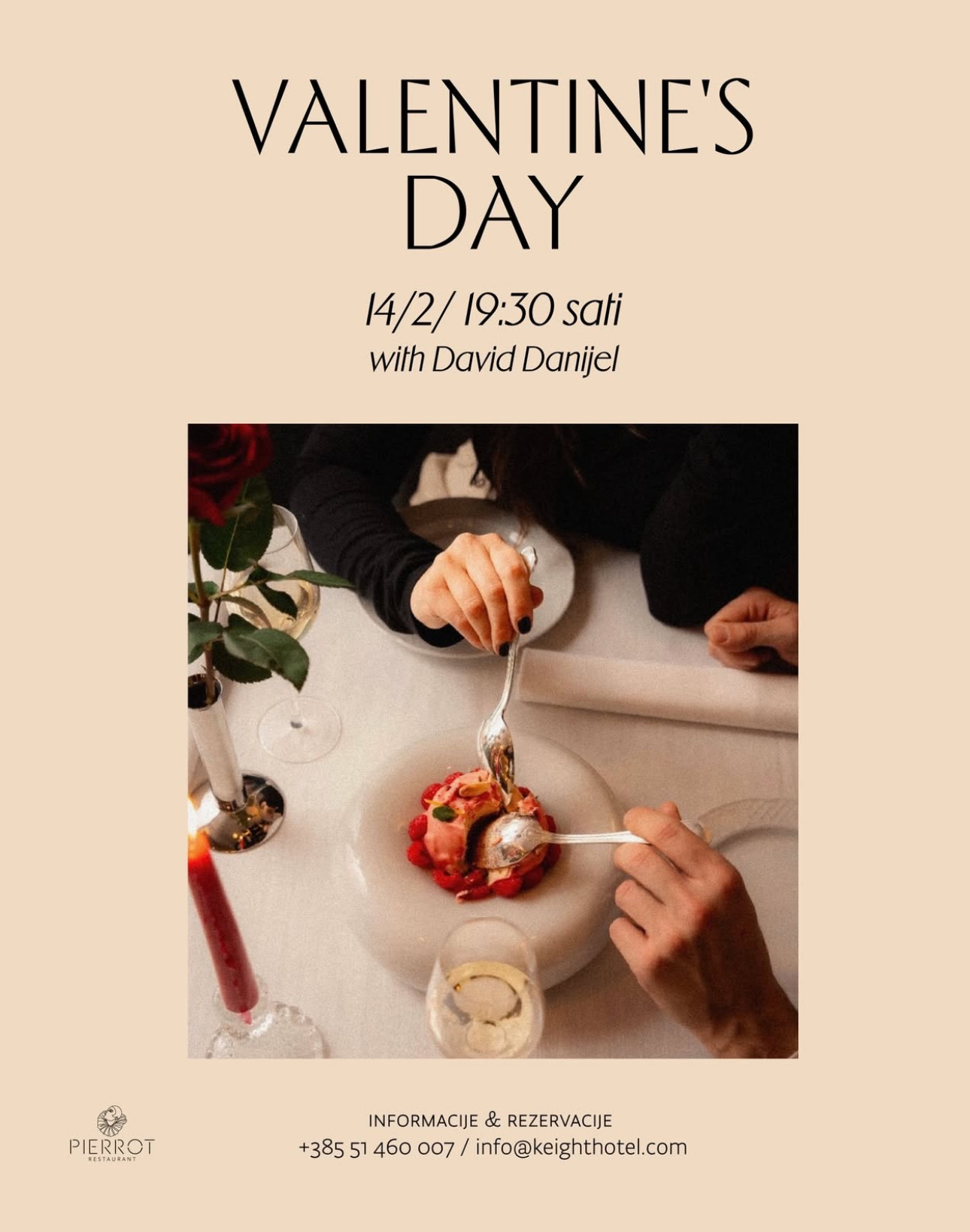 Keight Hotel u Opatiji Valentinovo obilježava na poseban način. Večer je stvorena za dijeljenje – uz fine dining, pažljivo kreiran meni i atmosferu koja dopušta da se sve uspori. Gosti mogu uživati u posebnim mesnim i ribljim degustacijskim menijima, uz live glazbu Davida Danijela. Rezervacije su obavezne na broj telefona: +385 51 460 007 ili putem e-maila: info@keighthotel.com