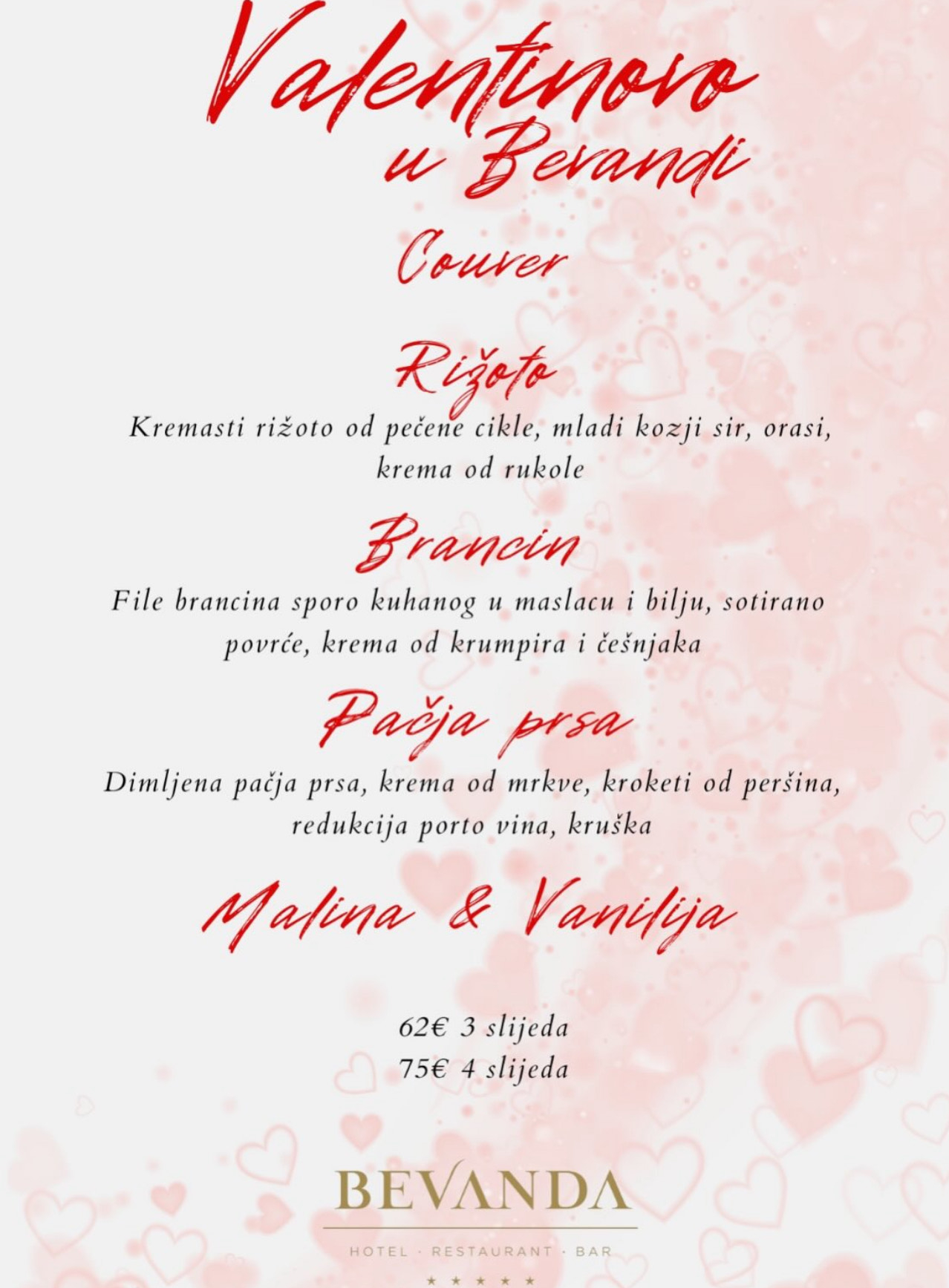 Hotel Bevanda za Valentinovo pripremio je posebno iskustvo u kojem se spajaju vrhunska gastronomija i romantična atmosfera. Gosti se mogu prepustiti pažljivo osmišljenom meniju uz glazbene ritmove E’n’P Acoustic Dua, a nakon večere večer se može nastaviti u hotel baru uz DJ-a Roberta Fishera. Oni koji Valentinovo odluče provesti i u hotelu mogu iskoristiti 10% popusta na smještaj 14. veljače uz promo kod LOVE. Rezervacije su obavezne putem e-maila reservations@bevanda.hr ili telefonom na 051 493 888.