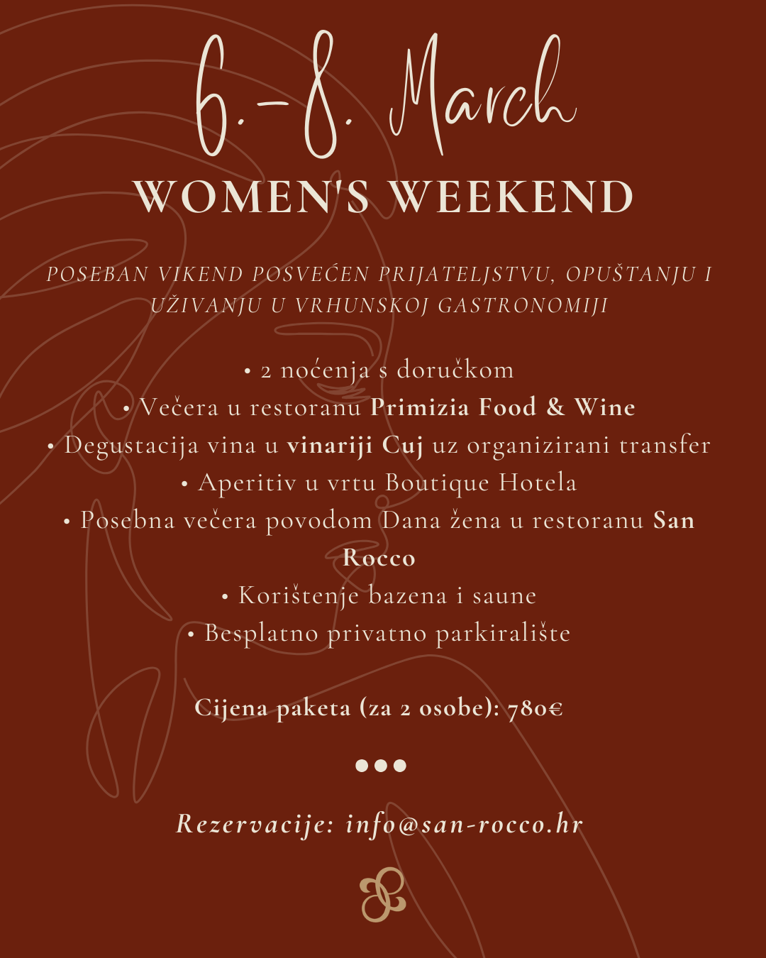 Poseban trenutak vikenda bit će svečana večera povodom Dana žena u Signature restoranu San Rocco, kreirana kako bi proslavila ženstvenost, prijateljstvo i hedonizam u najljepšem okruženju. Vikend započinje aperitivom u vrtu hotela, savršenim uvodom u opuštenu i elegantnu atmosferu koja vas prati kroz cijeli boravak. Tijekom boravka na raspolaganju su vam bazen i sauna za potpuno opuštanje, kao i besplatno privatno parkiralište.