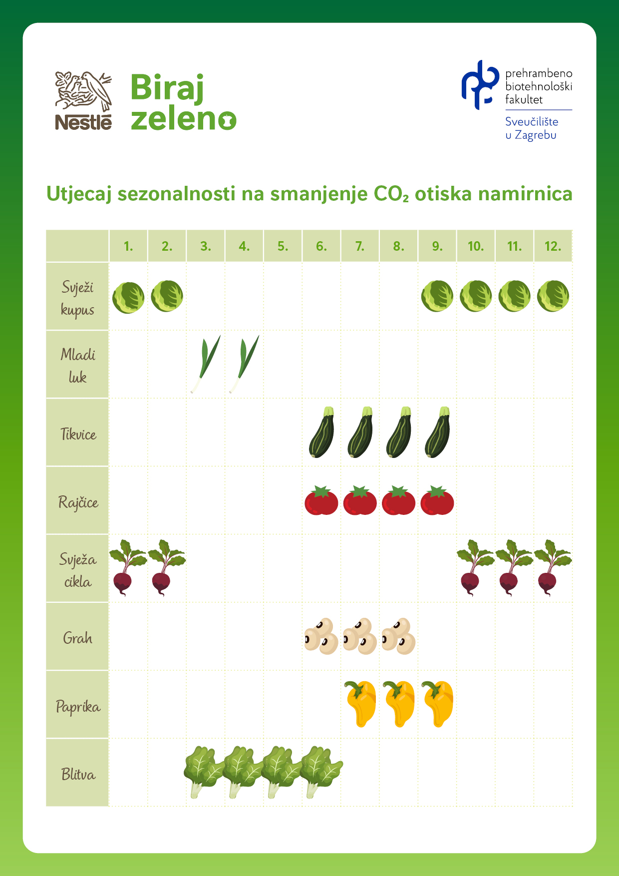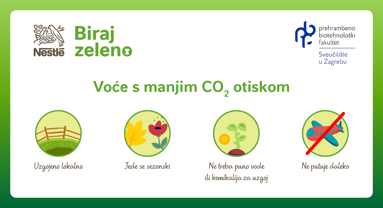 Upravo zato inicijativa Biraj zeleno, koju provodi Nestlé, educira i potiče potrošače na održivije prehrambene navike te smanjenje otpada od hrane u kućanstvima. U sklopu inicijative, Nestlé surađuje sa stručnjacima Prehrambeno-biotehnološkog fakulteta Sveučilišta u Zagrebu (PBF), koji analiziraju ugljični otisak različitih namirnica i razvijaju smjernice koje potrošačima pomažu smanjiti utjecaj na okoliš.