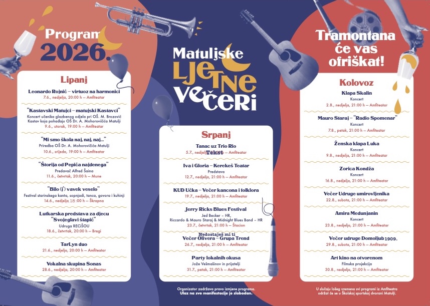 izdanje manifestacije Matuljske ljetne večeri – „Tramontana će vas ofriškat“ ove godine donosi bogat i raznolik program koji će tijekom lipnja, srpnja i kolovoza ponovno oživjeti kulturnu scenu Matulja. Manifestacija započinje u nedjelju, 7. lipnja, nastupom mladog virtuoza na harmonici Leonarda Rojnića u matuljskom Amfiteatru.