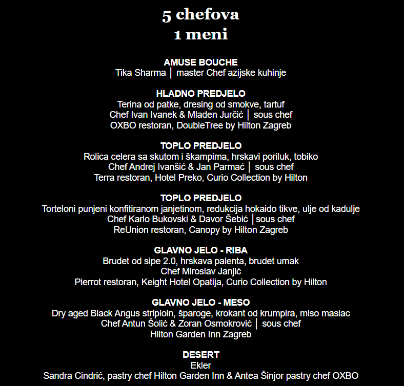 Riječ je o jedinstvenom kulinarskom konceptu koji okuplja pet vrhunskih chefova iz različitih Hilton Hotels & Resorts hotela – iz Zagreba, Opatije i Preka – s ciljem stvaranja nezaboravnog gastronomskog iskustva kroz pažljivo osmišljen meni od sedam sljedova. Svaki chef donosi vlastiti stil, tehniku i inspiraciju, a zajedno oblikuju večeru koja spaja suvremene kulinarske trendove s lokalnim namirnicama i autentičnim okusima.